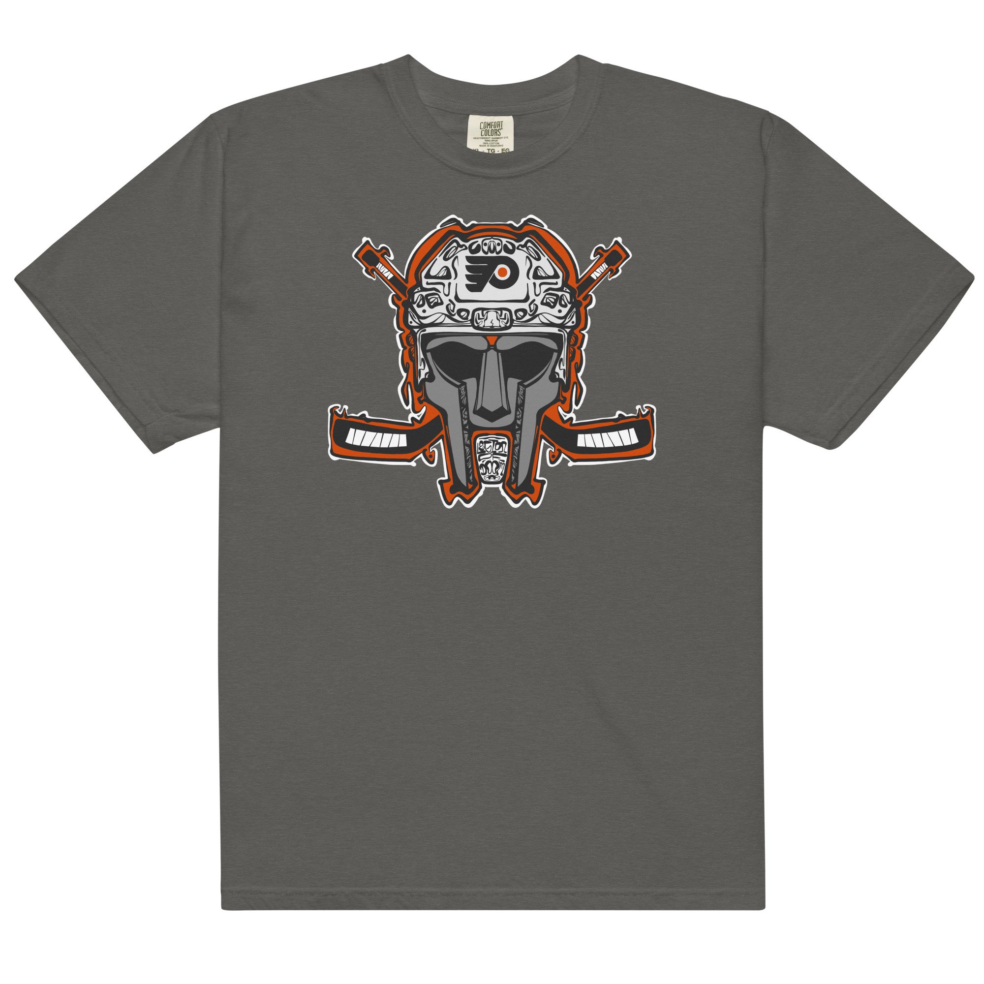Our pepper “Legion of Doomsday” tee reimagines the unmistakable mask of MF Doom through the lens of Philly hockey history — armored with a classic hockey helmet as a tribute to one of the most feared lines to ever hit the ice. It’s a collision of underground iconography and South Philly folklore, built for the fans who understand both bars and body checks.